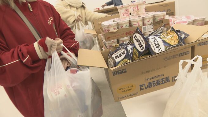 関谷名加アナウンサー:「フードパントリーとは、様々な理由で困っている人に無料で日用品や食料を配る活動のことです。こちら県立大学の1階ラウンジでは学生が続々と集まってきています」