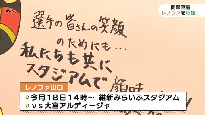 ボードは今月17日午前9時まで置かれていて、それまでメッセージを書き込むことができます。レノファ山口は、今月18日、ホームで大宮アルディージャと対戦します。応援メッセージが書かれたボードは開幕戦当日、選手たちに披露されることになっています。