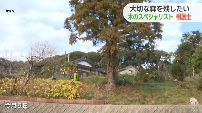 今度は、民家の近くにそびえる杉の木を切ってほしいという依頼です。風が吹くと根元が揺れ、コンクリートの壁が崩れる心配があり、伐採を依頼したそうです。