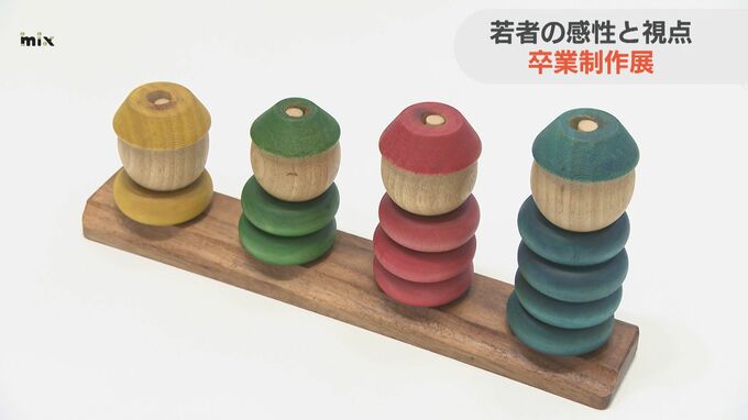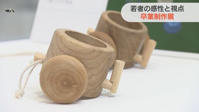 県立大学文化創造学科の卒業展には日本文化とデザインを学んだ学生による作品59点が展示されています。テーマは自由で、地域の課題解決につながる作品をおよそ1年かけて仕上げました。