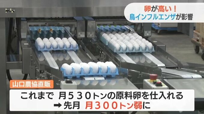 山口農協直販では月に530トンほどの原料卵を仕入れていましたが、先月は300トン弱にまで減っているそうです。鳥インフルエンザが発生した広島や福岡からの入荷が止まり、別のルートで確保できるよう手配するものの、全国的な卵不足で十分な量の確保は難しいと言います。