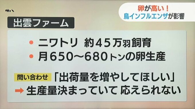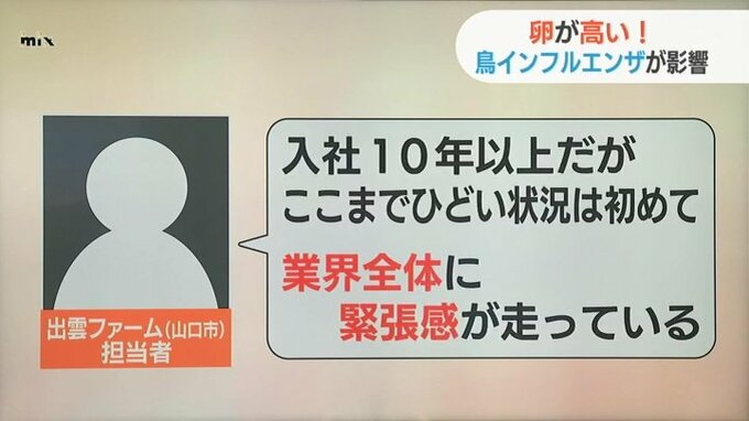 卵の生産を行う山口市の出雲ファームの担当者に聞いてみると、「入社10年以上になるがここまでひどい状況は初めて。業界全体に緊張感が走っている」と話します。