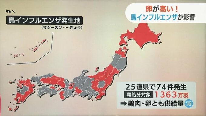 今シーズン、鳥インフルエンザが全国的に拡大しています。25道県で74件の鳥インフルエンザが発生。これにより、およそ1363万羽が処分の対象になっていて、鶏肉、卵ともに供給量が減っているのです。