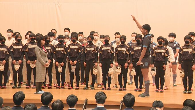 中国大会に出場するラグビー部は、1月29日に行われた県決勝戦で大津緑洋を破り、創部36年目にして初めての優勝を果たしました。式では各部のキャプテンが意気込みを語りました。
