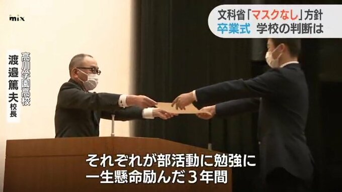 「マスクなし」決めた学校も どうなる高校卒業式 2023年2月13日(月) 18:26 国内 マスク着用緩和の流れの中、文部科学省は卒業式についての基本方針を示しました。入退場や式辞、卒業証書授与、送辞や答辞については「マスクをはずして差し支えない」。校歌斉唱などは、「一定の感染対策を講じる…