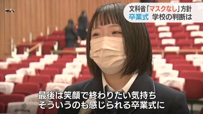 「最後笑顔で終わりたいって気持ちがあるからそういうのも感じられる卒業式になると思うので、マスクをはずすって言うことはすごくいいことだと思うしすごく感謝しています」