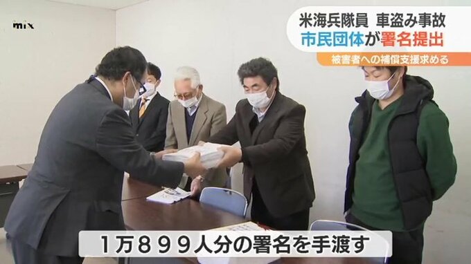 車窃盗などで在宅起訴の米海兵隊員の男 市民団体が中四国防衛局に被害の補償をアメリカ側に促すこと等求め署名提出 2023年2月27日(月) 20:28 国内 去年12月アメリカ軍岩国基地の海兵隊の男が店舗に侵入し新車を盗んだなどとして在宅起訴された事件で、市民団体が中国四国防衛局に被害者への補償を支援するよう署名を提出しました。署名を提出したのは「市民連合…