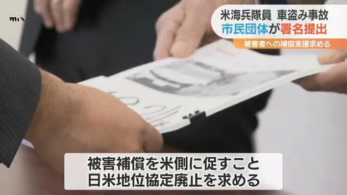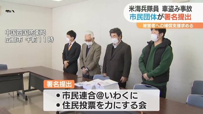 去年12月アメリカ軍岩国基地の海兵隊の男が店舗に侵入し新車を盗んだなどとして在宅起訴された事件で、市民団体が中国四国防衛局に被害者への補償を支援するよう署名を提出しました。