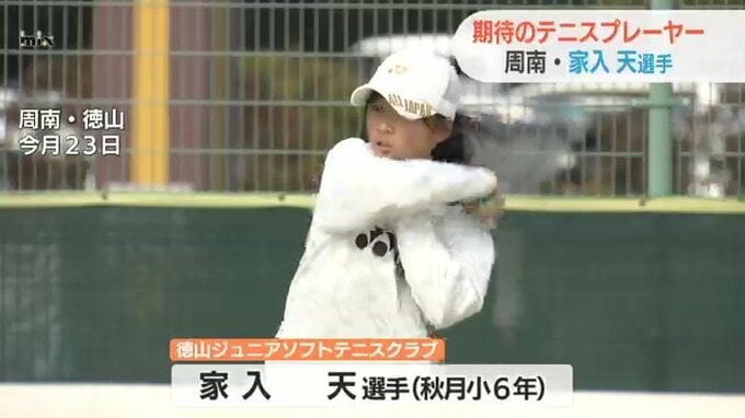 西日本の大会にダブルスで出場し、県勢初の優勝を飾った小学生女子ソフトテニスプレーヤー、周南市の家入 天選手。10大会以上で優勝するなど、山口県内で期待の選手なんです。
