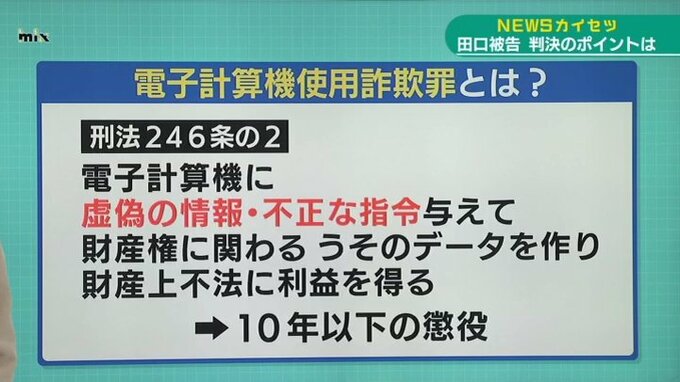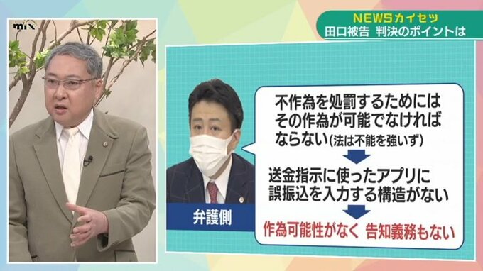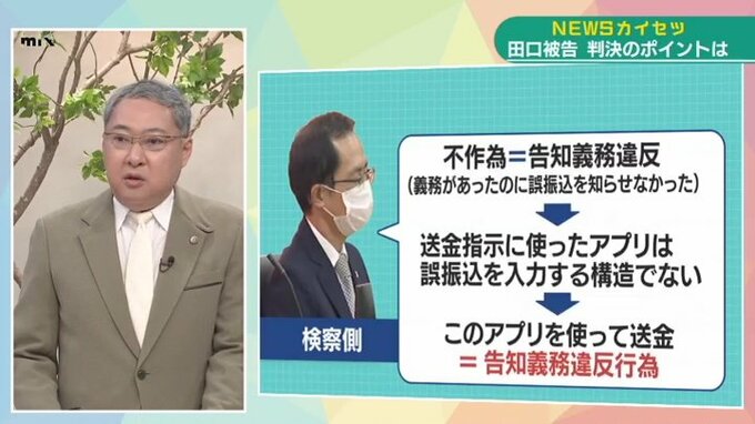 「検察側の主張ですが、オンラインカジノに金を送金する前の段階で、銀行に「誤振り込みの入金が資金源ですよ」ということを知らせなきゃいけなかったというものです。その送金指示に、田口被告が使った銀行のアプリは誤振り込みかどうかを入力するような構造になっていない。そういうアプリを使うこと自体が、虚偽の情報を入力したものなんだというのが検察側の主張です」