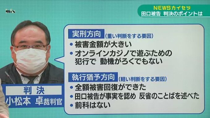 「対してどこまでいっても財産的損失が一番重視されるということになるので、結果的に誰の金であるかは問わないけれども、阿武町の損失が全額回復できたということは無視はできない。これはかなり大きい要因です。あと今回の裁判所は、とても丁寧な審理をしたなと思います。弁護人が言っていたように事実関係を田口被告が争っているわけでもないし、田口被告が反省していないわけでもない。ただ弁護人として、法律の専門家として犯罪成立の法律判断には疑問があると、だから不利益な判断はしてくれるなということをずっと言っていたかと思うんですが、裁判所はそこはちゃんと区別をして、無罪主張があったけれど法律上の問題にすぎないから、事実関係を認めて反省の態度・言葉を述べているということは評価をした。一般論ですが前科がないので、こういった有利な情状を考えると、被害回復ができたことが大きいですから、執行猶予付きの判決ということになったと思います。ですが、執行猶予5年というのは一番長い猶予期間です。」