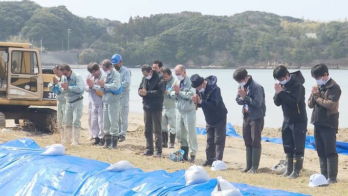 作業は午前9時過ぎから始まりました。当初は25トンクレーンを使っていましたが、クジラが重すぎて持ち上げることができず、60トンクレーンに変えて午後から作業を再開。クジラを持ち上げ、海岸に掘った深さ3メートルの穴に埋めました。途中、作業員がヘルメットを取って静かに手を合わせ、クジラを弔いました。