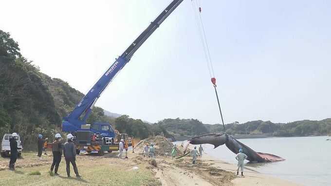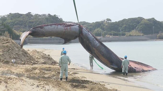 市農林水産課によりますと体長13メートルで、重さ12.5トンのオスの成体とみられています。市の把握では今年度、市内に漂着したクジラは2例目ということです。