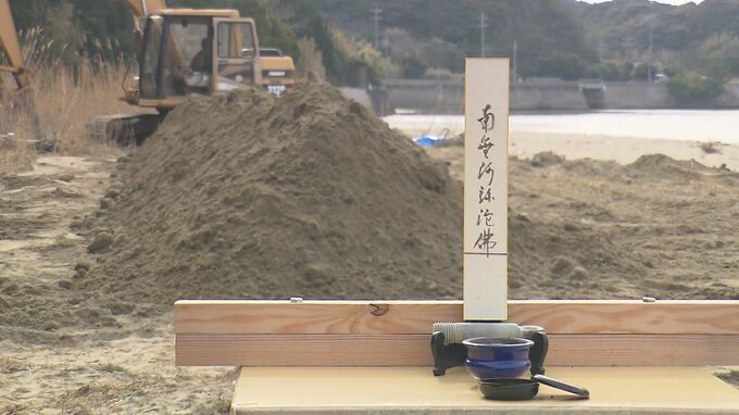 山口県長門市の漁港に打ち上げられ死んでいる状態で見つかったクジラを埋める作業が、8日午後2時半ごろ終わりました。地域住民らが住職とともに手を合わせ、クジラを弔いました。