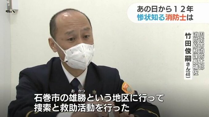 2011年3月11日。国内では史上最大となるマグニチュード9.0を記録する東日本大震災が発生しました。この震災による死者は1万5900人。行方不明者は2500人を超えます。発生から3日後、県内の消防士で作る「県緊急消防援助隊」は、宮城県石巻市へ向かいました。竹田さんは、その一員でした。