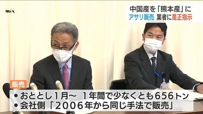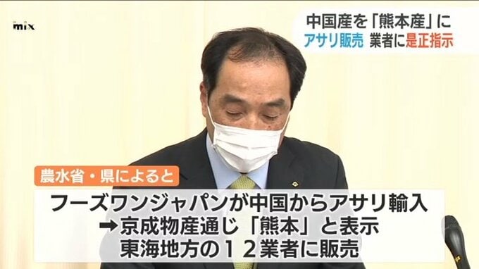 農水省と県によりますと、「フーズワンジャパン」が中国から輸入したアサリを「京成物産」を通じて、原産地を熊本と表示し、東海地方の12の業者に販売していたということです。