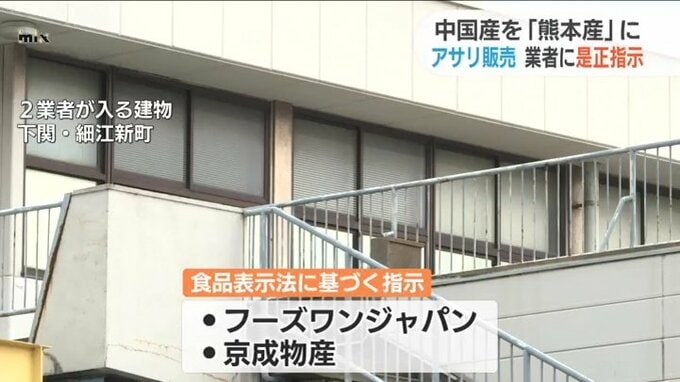 中国産のアサリを熊本産として販売していたとして農林水産省と県が、下関市の業者に食品表示法に基づいて是正を指示しました。