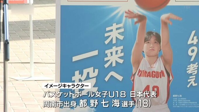 投票率の低い若者に呼びかけようと、今回は、山口県周南市出身のバスケットボール女子U18日本代表・都野七海選手をイメージキャラクターに起用しました。