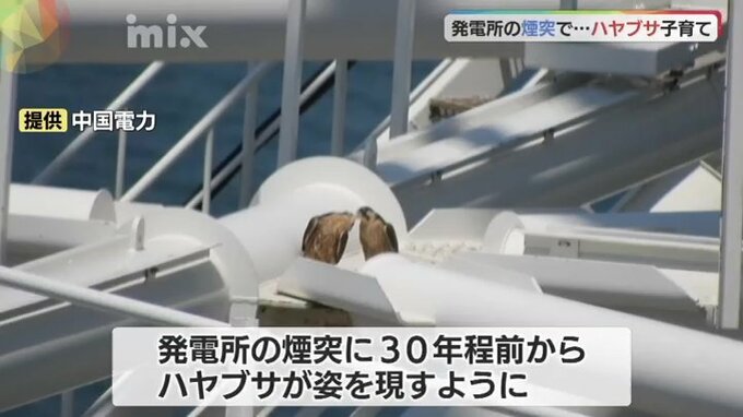 山口県の中国電力新小野田発電所の煙突には、30年ほど前からハヤブサが姿を現すようになりました。今年も地上50メートルに作られた巣箱では、2羽のひながすくすくと育っています。