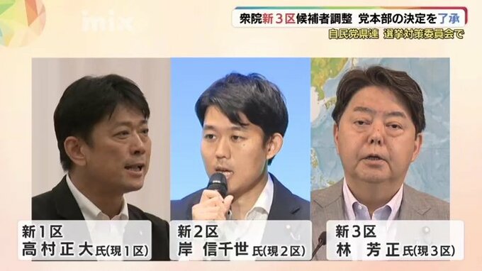 自民党党本部は新1区を現在1区の高村正大さん、新2区を現在2区の岸信千世さん、