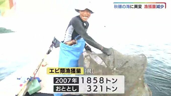 秋穂を襲っている異変とは、漁獲量の減少です。秋穂といえば「えびの町」。多いときは1回の漁で天然のエビが100キロほど取れていたそうですが、最近はほとんど取れなくなっているといいます。県全体のエビ類の漁獲量も2007年は1800トンを超えていましたが、おととしは321トンにまで減っています。背景にあるのは、温暖化と漁師の高齢化です。