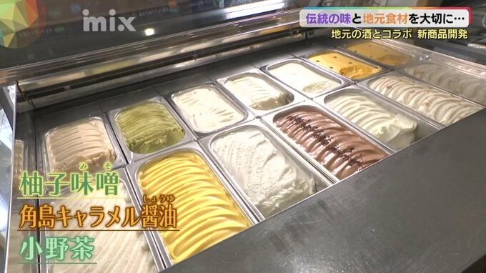 宮城で人気だった商品を伝え続けている一方で、地元食材を使った商品開発にも取り組んでいます。地産地消のフレーバーとして「柚子味噌」や「角島キャラメル醤油」、それに「小野茶」などここでしか味わえないジェラートを生み出しています。