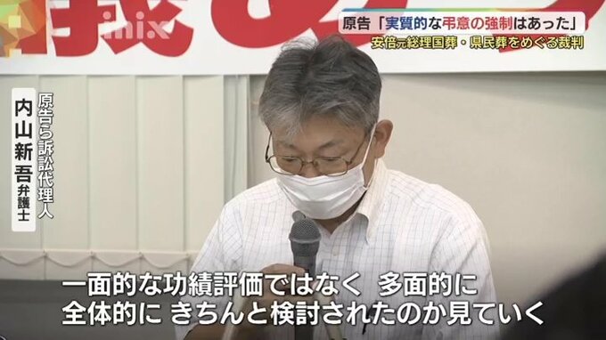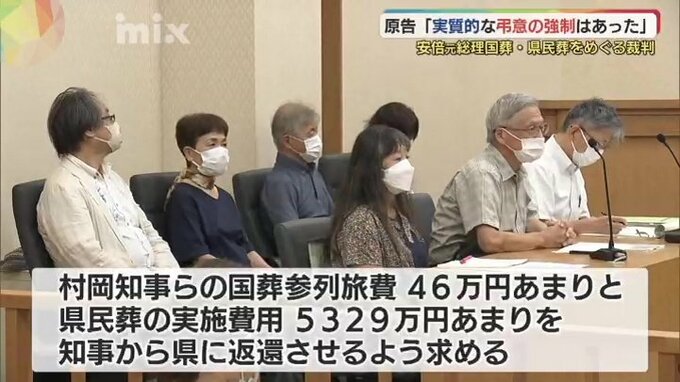 訴えによると原告側は、国葬や県民葬の開催は法的根拠がなく、敬意や弔意を強制するもので、憲法の定める思想、良心の自由を侵害するなどとしています。