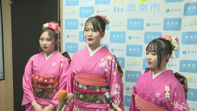 華やかな着物姿で周南市の藤井律子市長を訪ねたのは、熊毛北高校ライフデザイン科の2年生3人と、勝間小学校5年生の神代真帆さんです。