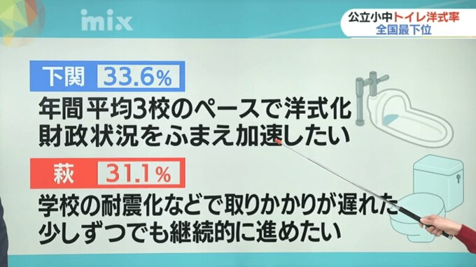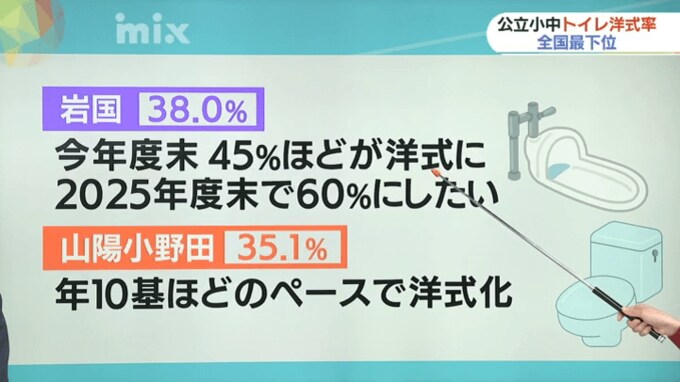 「去年から取り組みを急いでいて、今年度末で45%ほどの洋式化を見込む。2025年度末時点で60パーセントにしたい」と話しています。