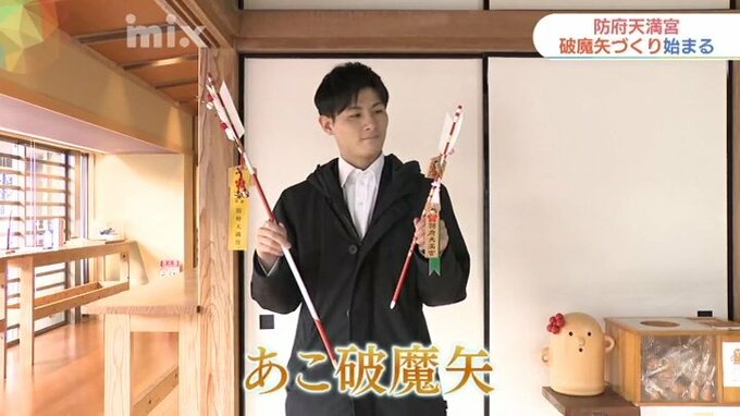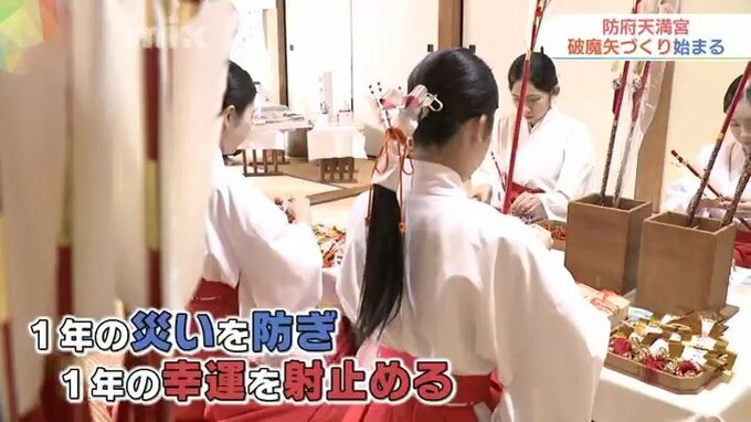 日本で最初に創建された天神様とされ、正月には多くの人が参拝に訪れる防府天満宮で破魔矢づくりが始まりました。破魔矢には1年の災いを防ぎ、1年の幸運を射止めるという意味が込められています。4人のみこが天満宮のシンボル「梅」や、絵馬を飾りつけていきました。