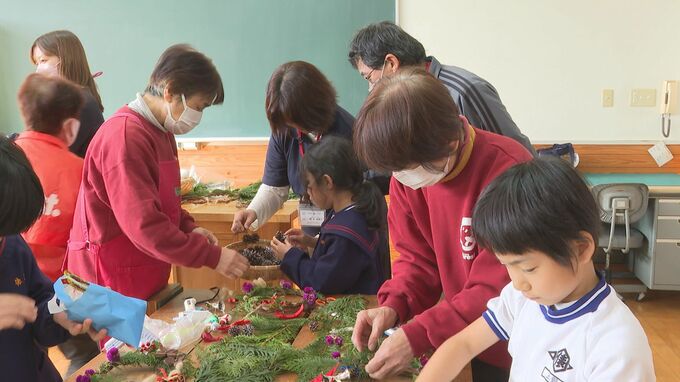 山口県長門市の小学生が5日、身近な森の恵みを使ってクリスマスリースを作りました。