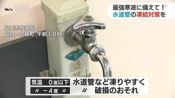 山口市水道局によりますと、気温が0度以下になると水道管などが凍りやすくなり、氷点下4度以下で破損のおそれが高くなるそうです。