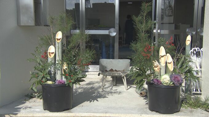 材料が整うと飾り付けです。門松は、平安時代の文献にも書き残されている古くからの習わしです。常に緑である松や竹を使い、年神様を迎え、子孫の末永い繁栄を祈る意味があるとされます。ほかに「難を転じる」というナンテンや葉ボタン、クマザサなどをあしらって仕上げました。