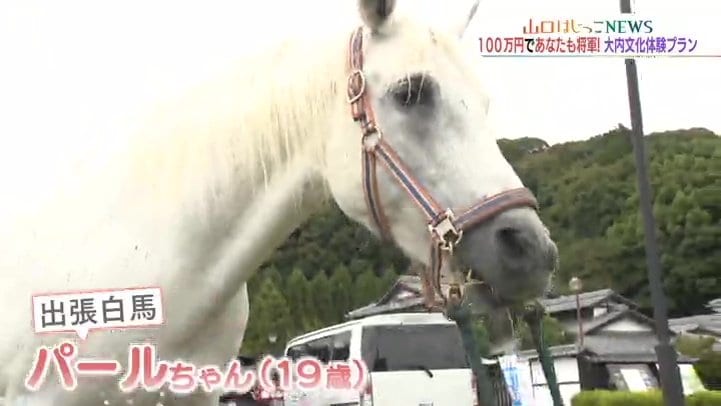 まず舞台となるのは、山口市にある菜香亭。そしてプランを盛り上げるため、県外からわざわざこの地に招へいされたのは、まさかの白馬。パールちゃん19歳。大好物はニンジンです。