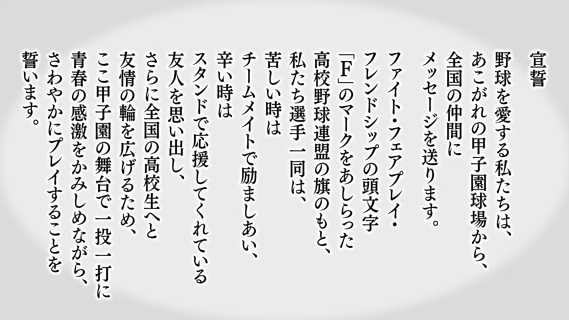 「宣誓。野球を愛する私たちは、あこがれの甲子園球場から、全国の仲間にメッセージを送ります。ファイト・フェアプレイ・フレンドシップの頭文字「F」のマークをあしらった高校野球連盟の旗のもと、私たち選手一同は、苦しい時はチームメイトで励ましあい、辛い時はスタンドで応援してくれている友人を思い出し、さらに全国の高校生へと友情の輪を広げるため、ここ甲子園の舞台で一投一打に青春の感激をかみしめながら、さわやかにプレイすることを誓います」