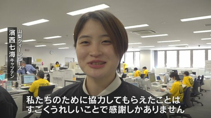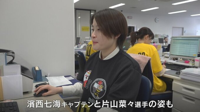 信用金庫に勤務する濱西七海キャプテンと片山菜々選手の姿もあり、Tシャツを着て仕事に励んでいました。
