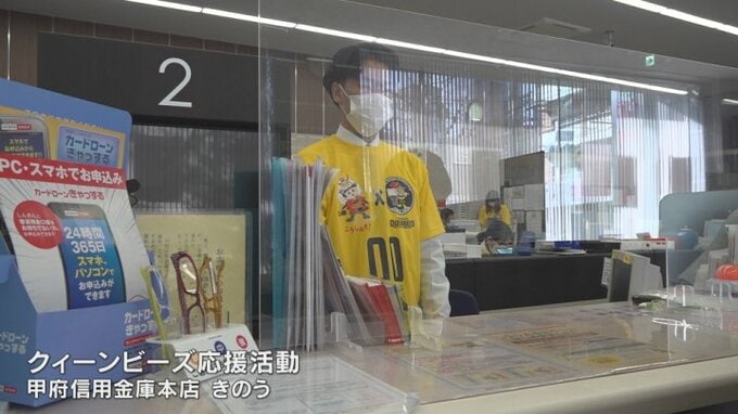 これは甲府信用金庫の本店と19の支店で初めて行われた取り組みで職員が山梨クィーンビーズのオリジナル応援Tシャツを着て窓口などの業務にあたりました。