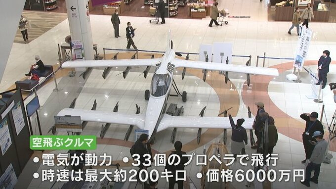 小型飛行機に似たこのクルマは電気を動力にした33個のプロペラで飛行し、最大時速は約200km、価格は6000万円です。