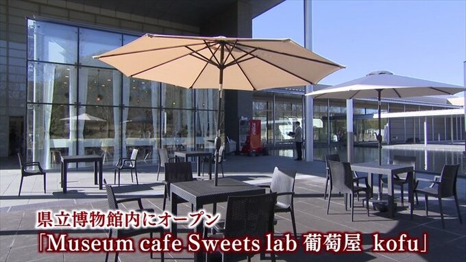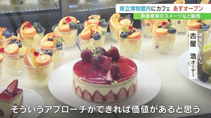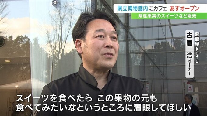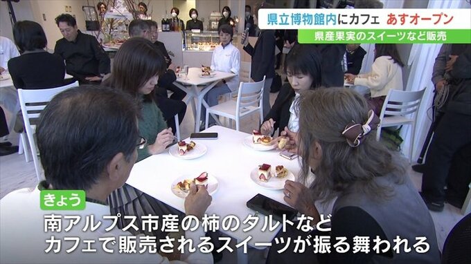 16日はブドウやモモの生産者らが参加してオープンを祝い、カフェで販売される北杜市で誕生したイチゴを使ったケーキや南アルプス市産の柿のタルトなどが振舞われました。