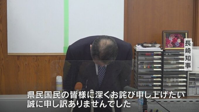 謝罪の言葉とともに深々と頭を下げた長崎知事。