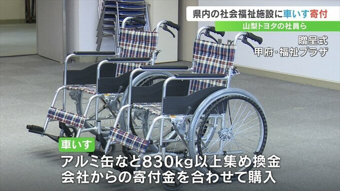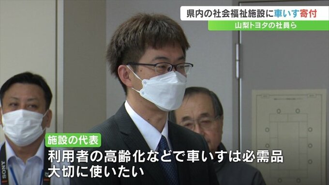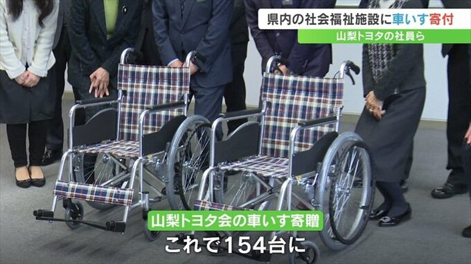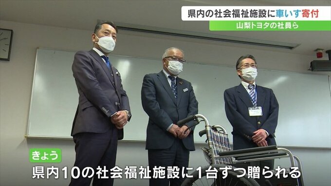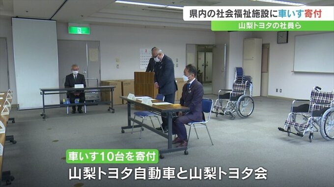 山梨トヨタ自動車とその社員らの団体が、県内の社会福祉施設に車いすを贈りました。