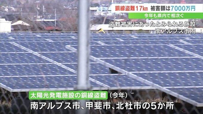 去年、各地で相次いだ太陽光発電施設から銅線ケーブルが盗まれる被害が今年、すでに山梨県内5か所で確認され、被害は17㎞、およそ7000万円に上っていることが分かりました。