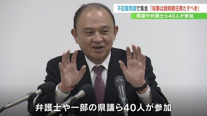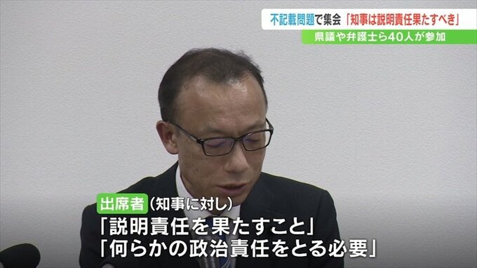 集会には弁護士や一部の県議ら約40人が参加し、出席者からは知事に対して説明責任を果たす事や何らかの政治責任をとることが必要という声が相次ぎました。