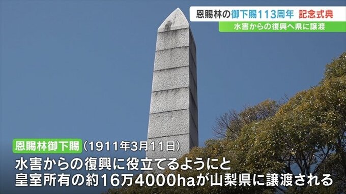 恩賜林は、1911年の3月11日に明治天皇が水害の復興に役立てるようにと皇室が所有していた森林約16万4000haを山梨県に下賜、つまり譲渡されたもので、今年で113周年となります。