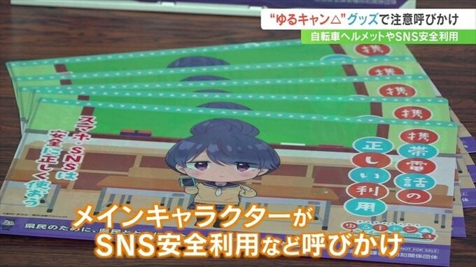 すべてのグッズでゆるキャンのメインキャラクターが「自転車に乗るときはヘルメットを着用しよう」や「スマホ・SNSは安全に正しく使おう」と呼びかけています。