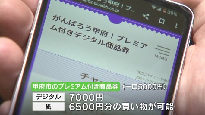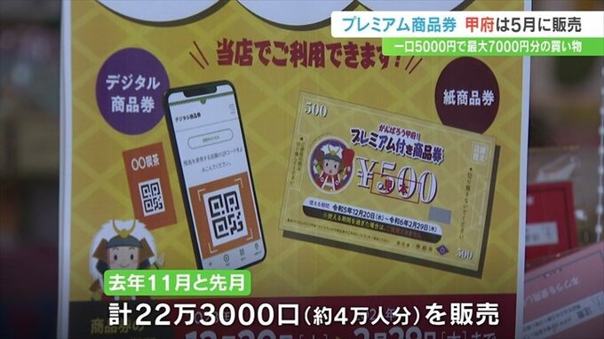 物価高騰対策となる甲府市のプレミアム付き商品券は一口5000円でデジタル版は7000円分、紙の商品券は6500円分の買い物ができ、去年11月と今年2月に約4万人分となる22万3000口が販売されました。