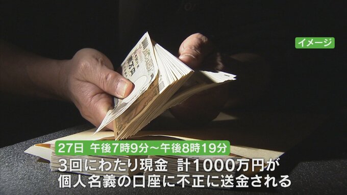 その結果、この日の午後7時9分から8時19分まで3回にわたり現金あわせて1000万円が個人名義の口座に不正に送金されたということです。