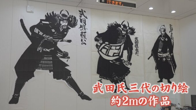 このうち信虎・信玄・勝頼の武田氏三代をモチーフにした切り絵は約2mあり、迫力満点ですが、よく見ると勇猛な表情や甲冑は繊細に切り出されています。