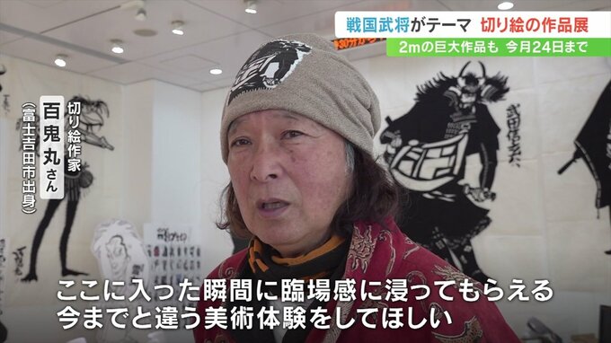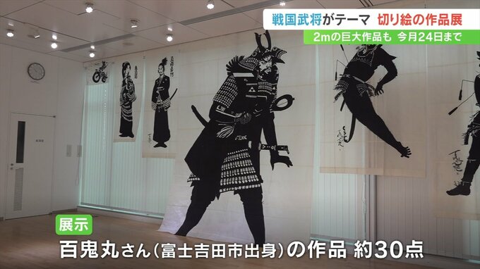 富士吉田市出身の切り絵作家 百鬼丸さんが手がけた戦国時代の武将の切り絵など、約30点が展示されています。