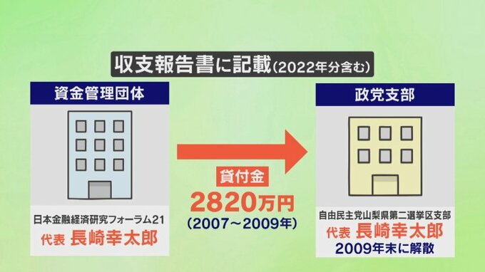 長崎知事の資金管理団体「日本金融経済研究フォーラム21」の収支報告書などによりますと、2007年から2009年までの間に、この政党支部「第二選挙区支部」に対してあわせて2820万円が貸し付けられ、それを返済しないまま政党支部は2009年12月に解散しています。